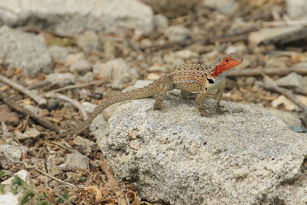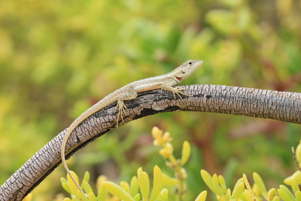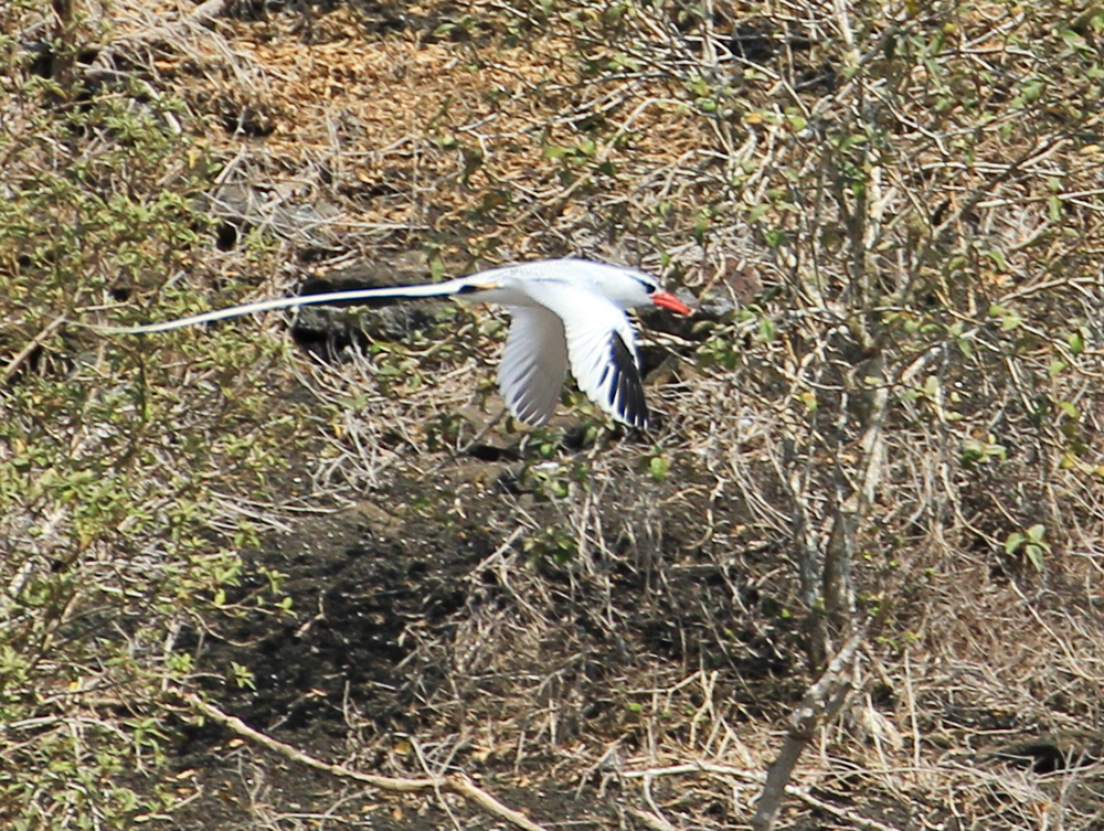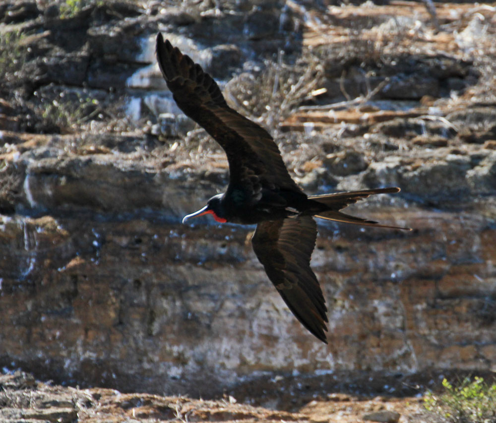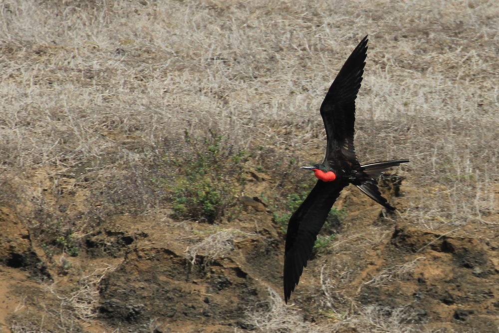| Lavafirbenene på Floriana har en anden tegning end på San Cristobal, tegningen ligner meget mere det, der hedder Española Lava Lizard | En Fregatfugl ved Floreana | Rødnæbbet Tropikfugl - Red-Billed Tropicbird - Phaethon aethereus. |
