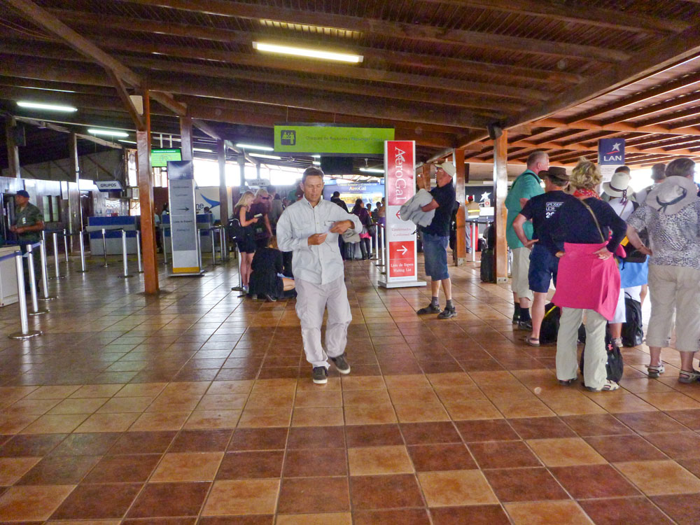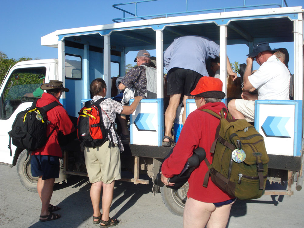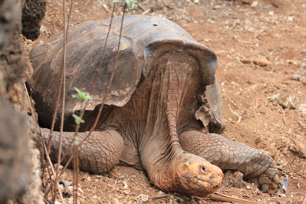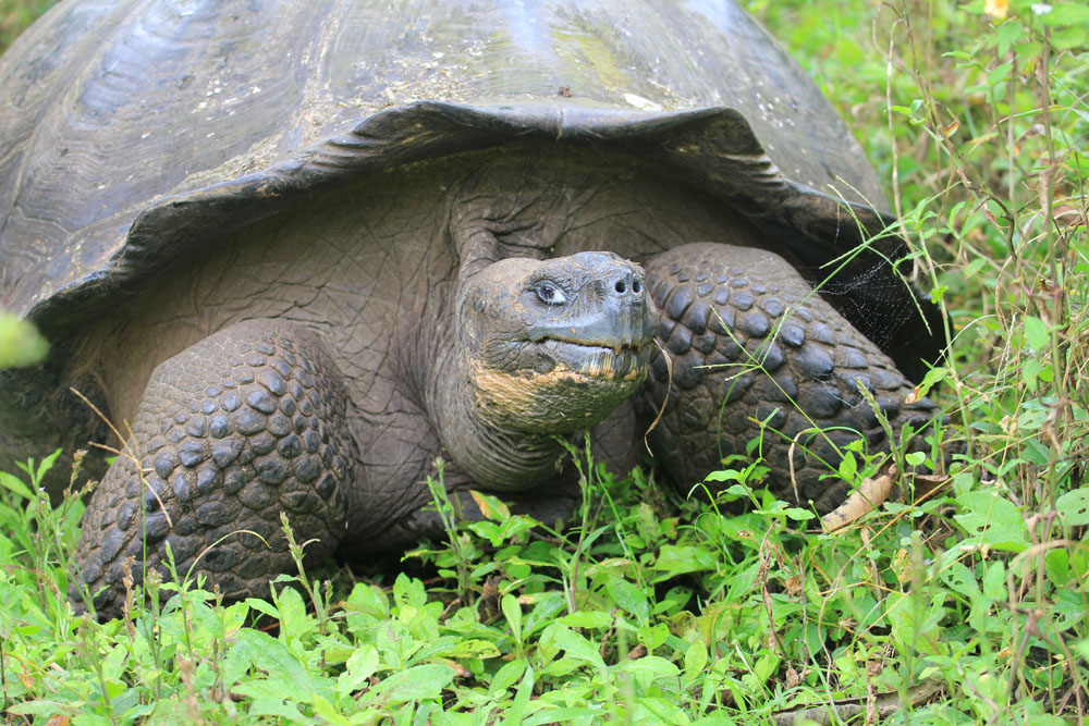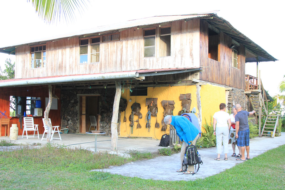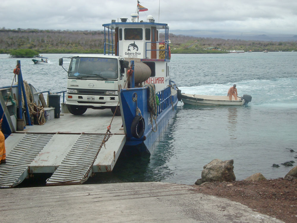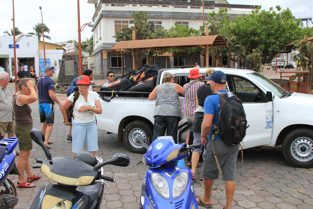 | Efter 2 timers sejlads ankom vi til Santa Cruz, hvor vi dannede kæde for at få bagagen fra borde, derpå blev bagagen læsset på en pickup der kørte bagagen til hotellet | Indgangen til Darwin centret | På Darwin centret opdrætter man bl.a. skildpadder med henblik på genudsættelse i den vilde natur |