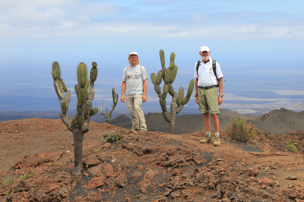 | Den Syvarmede Lysestage Kaktus - Candelabre Cactus i gennemsnit vokser 10 mm om året, dvs. den på billedet er ca. 400 år gammel | Galapagos fluesnapper | Charles Darwin står ved Darwin bugten og skuer ind over San Christobal |