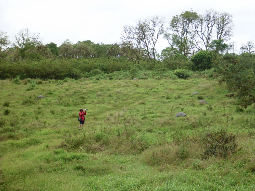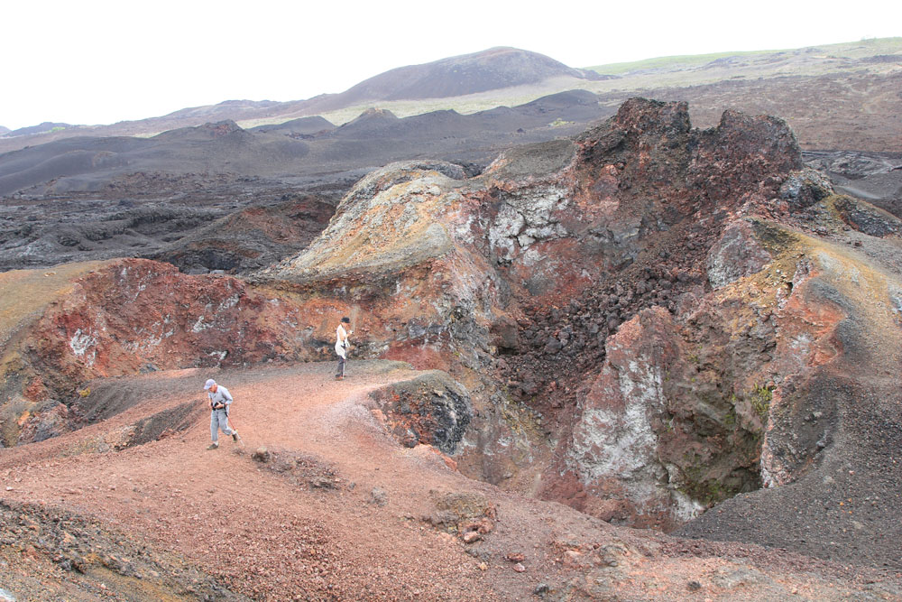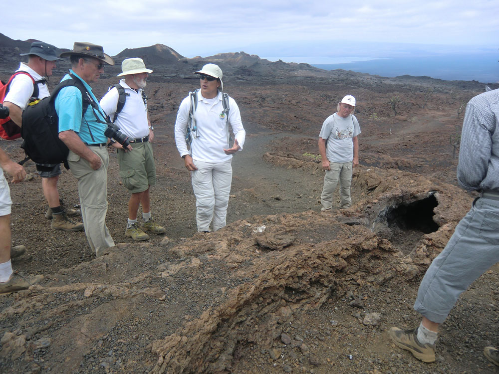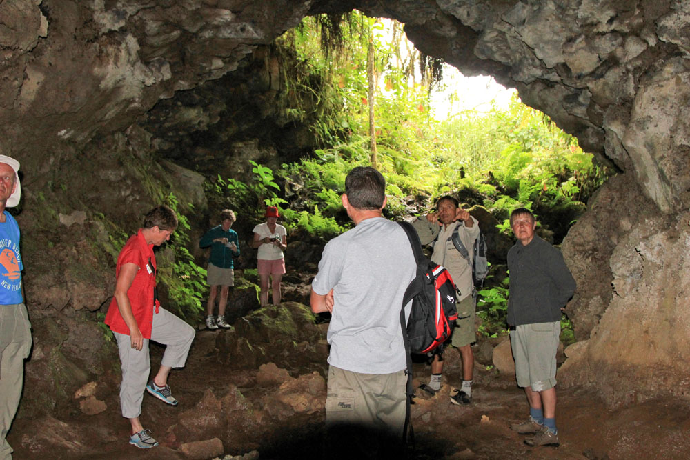 | På vej mod toppen blev der mindre og mindre bevokning, her er kun lidt græstuer og Candelabra kaktus tilbage | Vi gjorde holdt ved en lavatunnel. Pepo fortalte, hvorledes de dannes ved, at lavaen størkner på overfladen, men bliver ved at løbe inden i den skal, der dannes. De findes i mange størrelser, den her var en af de mindre |