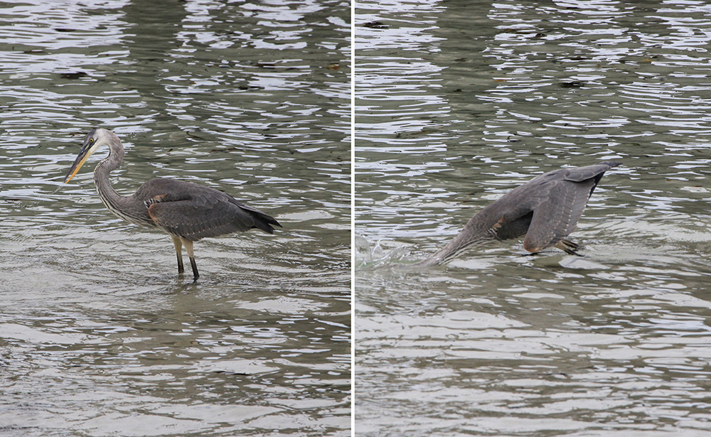 | Lørdag 17. november. En Stor Blåhejre - Great Blue Heron stod og fiskede på det lave vand ved havnen | Dagens udflugt begyndte på en lavaklippeø, hvor det vrimlede med havleguaner | I en kanal, som var blevet afskåret fra havet, var en flok Hvidtippede Revhajer - White-Tipped Reef Shark blevet fanget i det lave vand |