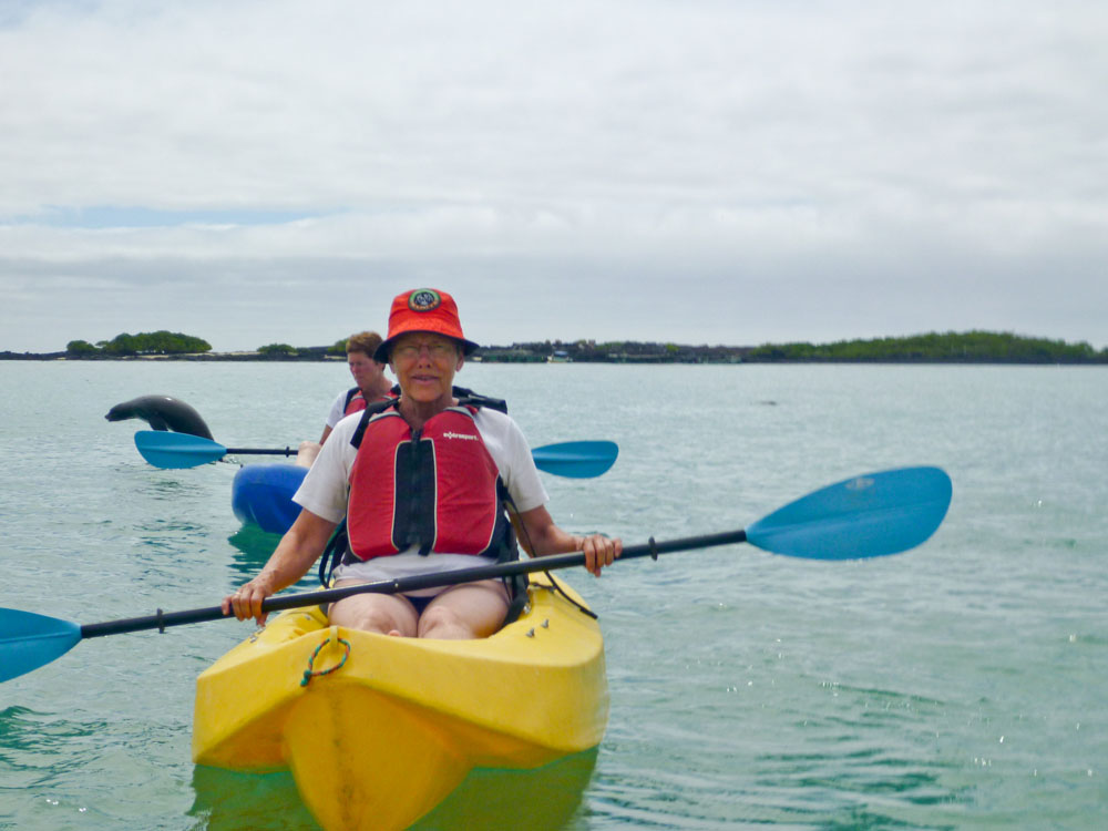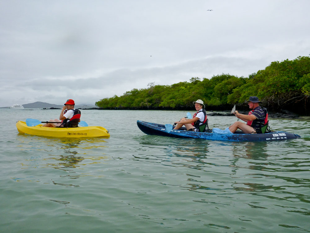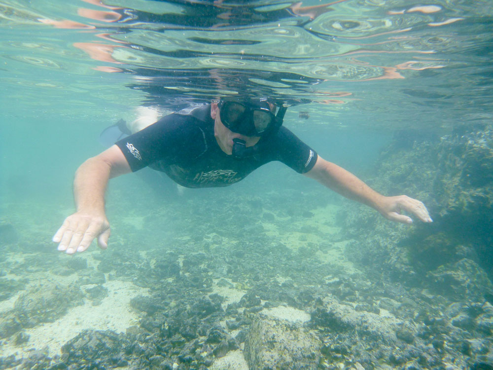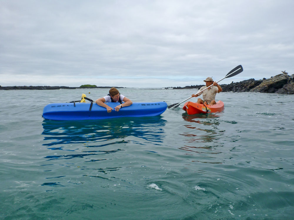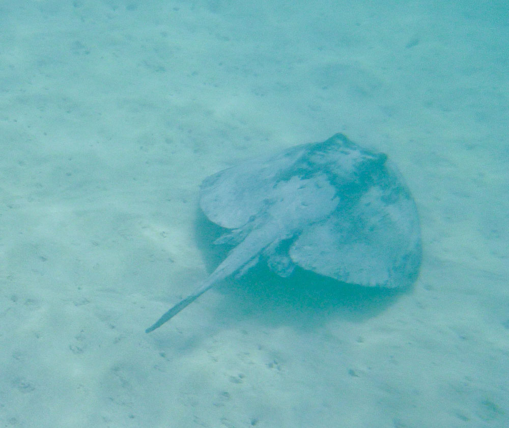 | Lone var en tur i baljen. Lidt senere blev det min tur til at "bade", men da havde jeg lært af Lone, hvordan man kommer op i kajakken igen | Grønne havskildpadder svømmede omkring kajakkerne | Under kajakkerne opdagede vi en Pigrokke - Diamond Stingray |