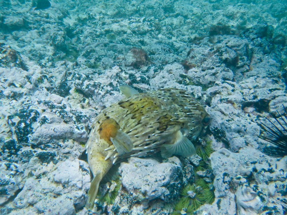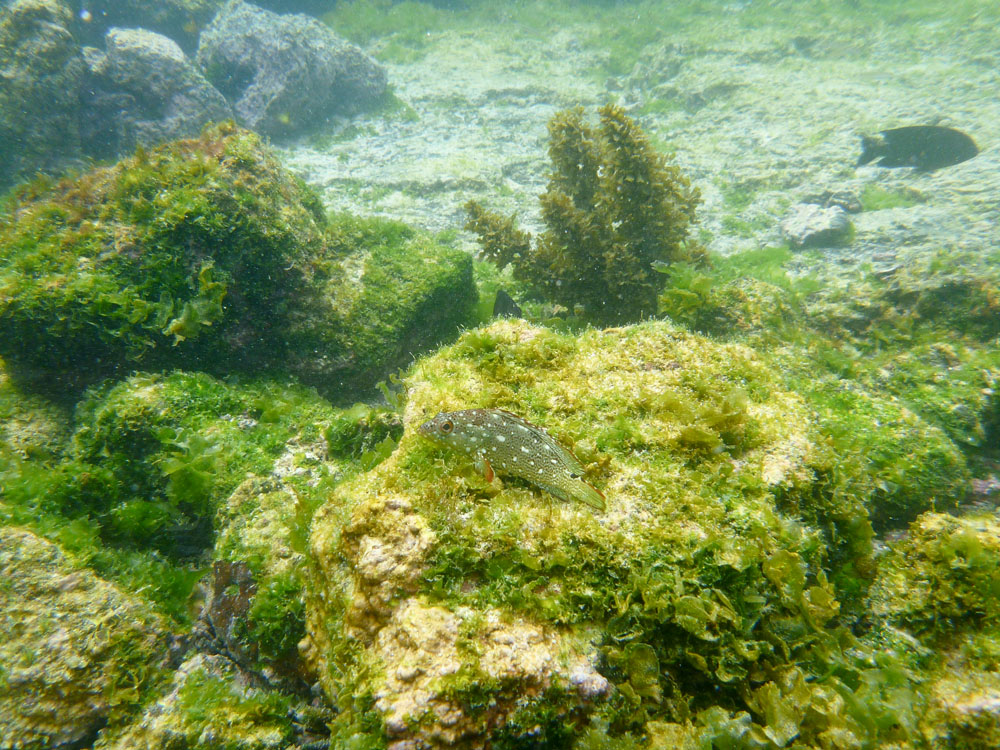 | Det var lavvande, inde på kysten sad havleguanerne direkte oven i deres mad. Læg mærke til Sally LetPåTå krabben, der sidder under den store havleguan | Vi skulle ud at dykke ved "den sovende løve", vi skulle svømme igennem spalten i hovedet på "løven", hvis vi var heldige, ville vi få hajer at se. | Vi så desværre ingen hajer, dertil var vandet både for mørkt og uklart, men der var da meget andet at kigge på. Søstjernen er en Blue Sea Star - Phataria unifascialis |