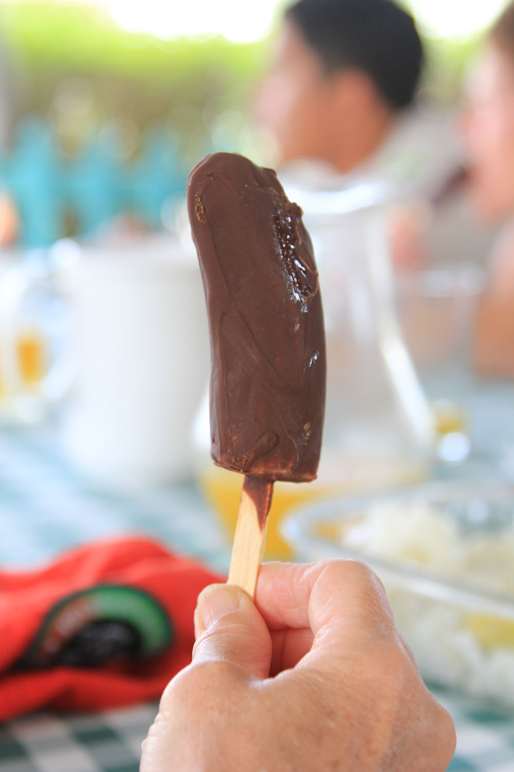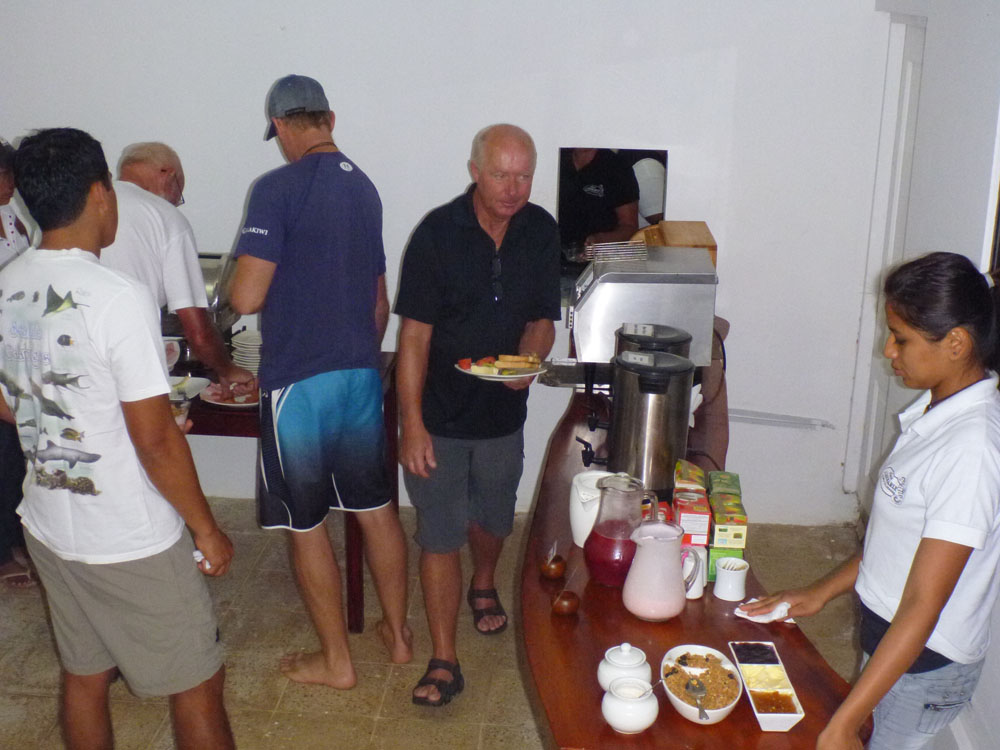 | Nogle var så heldige at se en Pindsvinefisk - Balloonfish på det lave vand | Det var ikke almindelige kajakker, men en type som man sidder oven på, de er væsentlig mere ustabile end normale kajakker, som man sidder nede i | Vores sidste måltid på Isabella var frokosten som blev indtaget på The Oasis. Deserten var en overraskelse, det var en frosset banan med chokoladeovertræk |