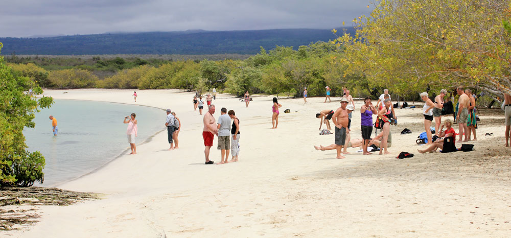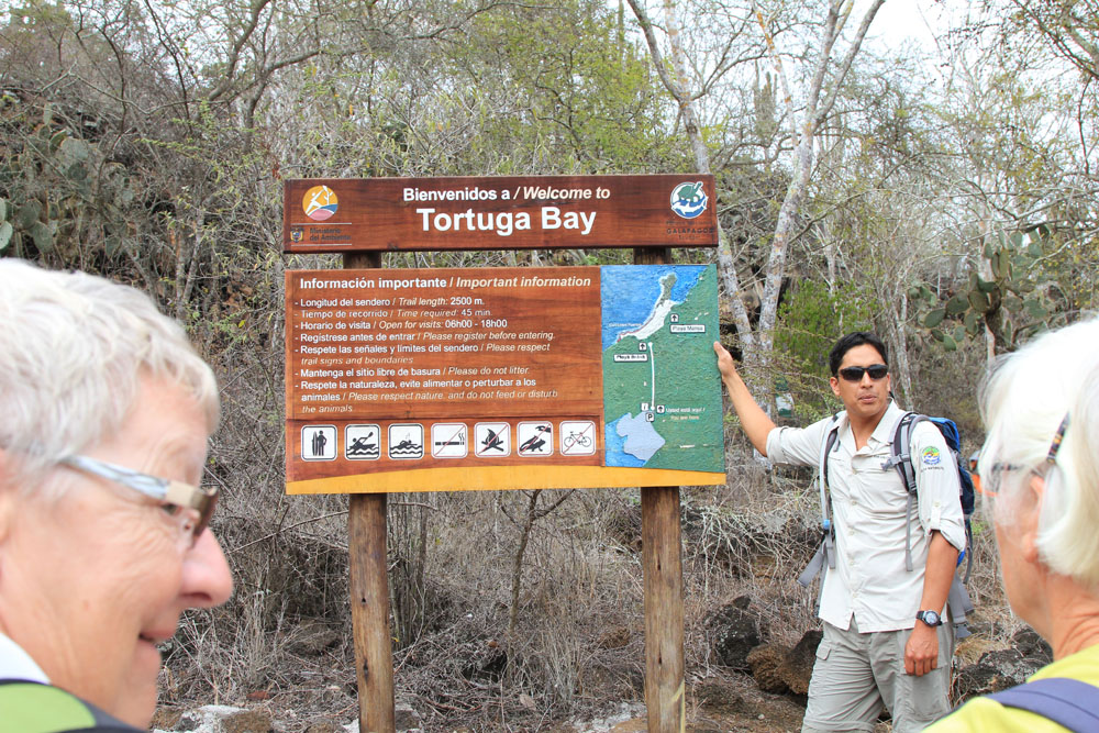 | Den bredde hvide sandstrand ved Tortuga Bay | Der var dømt badning | Vi kom meget tæt på de Blåfoddede Suler på vandreturen |