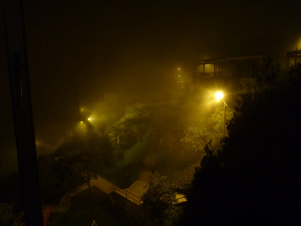 | Klar i lufthavnen på Baltra | Tilbage i Quito | Tæt tåge over Quito om natten |