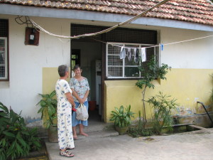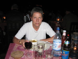 | I gården til Rama's hus sad hans gamle moder i skyggen under et træ og lavede håndarbejde. | En aften inviterede vi så familien Rahmadan på middag på Restaurant Pagoda inde i byen. Deres søn var også inviteret, men han havde travlt med sine studier. Her er det Sophie, Jena, Vibeke og Rama. | |