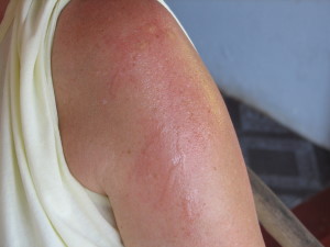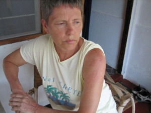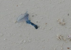 | En dag vi var ude at bade, var Vibeke så uheldig at svømme ind i en brandmand, det er sådan en der er på billedet til højre. De er ikke ret store, selve luftposen som får dem til af flyde på overfladen er på størrelse med en 5 kr. Tråden der hænger under dem er over 20 cm lang når den er strakt ud i vandet. De lokale fortalte at der er nogen som er dukket op efter Tsunamien. Det er de samme vi har set i Australien, jeg er ikke sikker på det er Tsunamien, jeg tror mere på, det er en klimaændring, som gør at de nu er kommet til Zanzibar. Smerten forsvandt efter nogle timer, efter vi havde behandlet med både eddike og antihistamin creme. Men "arret" efter forbrændingen holdt sig i over en måned bag efter. | ||