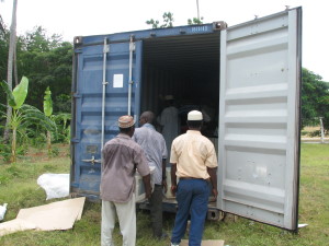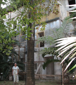 | I bushen i nærheden af det hus vi boede i fra 1974 til 1976 lå der en ruin af et gammelt Sultan palads. Nu er der ikke længere bush, men parcelhuse i området og ruinen er ved at blive sat i stand, den skal være hotel. | Noget af det sidste vi oplevede på Zanzibar, inden vi tog på Safari, var at den 26. kom containeren med computerne ud af havnen. Her er den ankommet til undervisningsministeriet og er blevet lukket op. Det var dejligt at se at alt havde holdt til transporten. Den havde været pakket forsvarligt, ved Mellemfolkeligt Samvirke var der mange historier om containere som kom frem med indholdet totalt ødelagt, så det var dejligt at se sin container blive åbnet. | |
