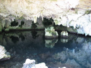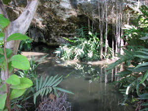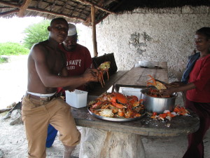 | Bag restauranten var køkkenhjælperne i gang med at ordne skaldyrene til middagsmaden. | En ny ting vi lærte om Zanzibar denne gang var at der findes underjordiske floder i Zanzibar. Her er vi ved en delvis underjordisk sø. På stranden lidt syd for Paje kan man ved lavvande se, hvor vandet fra en af floderne løber ud i det Indiske Ocean. | |
