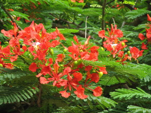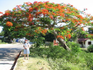 | Her er stranden ved lavvande, så kunne vi ikke bade, men det var kun når lavvande var om morgenen eller aftenen at vi ikke kunne bade. | Flametræerne er meget flotte på denne årstid, træet her står ved landevejen, hvor vi boede i hytterne, den lille hvide bygning til højre er en Police Post. | Flametræets blomster er fantastisk flotte, også når man kommer tæt på. |