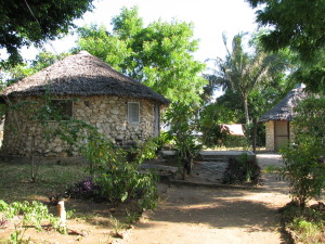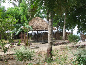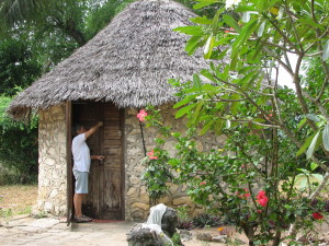 | Vi havde lejet nogle små hytter som ligger ca. 7 km fra centrum at Zanzibar Stone Town, stedet hedder Beit-el-Ras, de er ejet af en dansk dame og passet af en anden dansk dame, som er gift med en zanzibari, hun hedder Bente og bor fast i Zanzibar. Hytterne ligger helt ud til vandet, og der er en fast parasol næsten i vandkanten, det er den på billedet til højre. Vi under parasollen hver morgen og spiste morgenmad. Det største problem vi havde i hytterne var, at der ofte ikke kom vand ud af vandhanerne, men så klarede vi os med det vand, vi havde fyldt i tønderne i huset, når vandet var der. Hytterne ligger ved siden af Nkruma Teacher College, som er Seminariet i Zanzibar. | ||