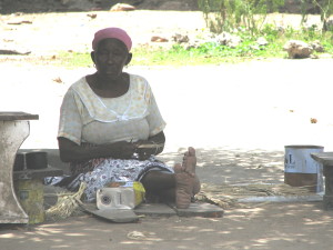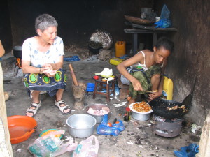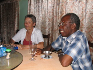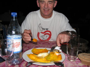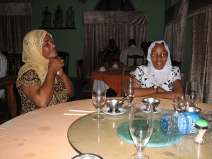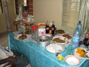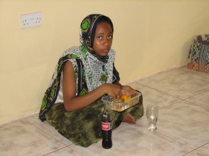 | En af dagene var vi inviteret til middag hos Rahmadan Bakari, en af mine gamle studerende. Her er hans 17 årige datter Jena i gang med at lave mad til os på trækulskomfuret. Vibeke fik udleveret en kanga, så hun ikke blev snavset. | Så er vi kommet til bords, der var lavet fantastisk meget mad, meget mere end vi kunne spise. Vi forsøgte at smage lidt af det hele, men det var næsten umuligt, så meget mad var der. Bemærk Vibeke spiser med fingrene efter lokal skik. | Jena som lavede maden til os, sad ikke ved bordet, det var kun Vibeke, Sophie, Rama og jeg. Jena var placeret på gulvet ved væggen modsat der hvor bordet stod. Det mad, Jena havde lavet, smagte bedre, end det mest af det vi fik på restauranterne. |