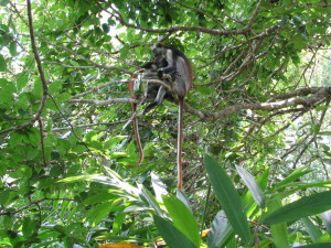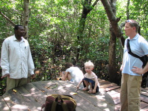 | Her er vi på besøg hos Bente, som vi lejede hytter og bil af. | Vi flyttede ud på hotel til Lisbeth og Jan, to svenskere, som driver et hotel Mdame i Paje. Derfra tog vi på tur til Josani Forest for at se de røde Colobus aber. | En del af turen til Josani Forest består af en guided tur rundt i en Mangrovesump, som ligger i tilknytning til regnskoven. Her er det Torben og Helene, som er med på turen, det er Beate som sidder nede bag Helene. |