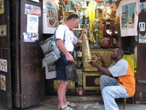 | Kaffesælgerne, som gik rundt i gaderne med messing kaffekande med trækulsbrænder under, er forsvundet fra gaderne, nu kan man kun se kaffekanderne hos marskandiserne. | Naturhistorisk museum havde engang til huse i den store gamle moskee i Zanzibar. Nu er man ved at restaurere moskeen, det var den officielle forklaring på, at hele samlingen var flyttet til en bygning på den anden side af gaden. Der var ingen håndværkere i moskeen. Hvis det er som med de fleste andre offentligt ejede bygninger, så er man begyndt renoveringen, men er så rendt tør for penge, og så får bygningen blot lov at fortsætte sit forfald. Det mest spændende i udstillingen er stadig den leopard, man skød og fik udstoppet for mange år siden i kolonitiden. | |