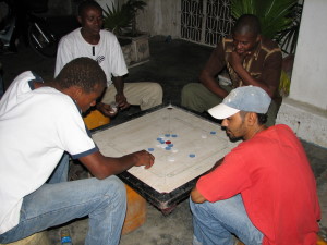 | Her er Vibeke i gang med aftensmaden en aften på Mercury. | Her er jeg så i gang med desserten, en gang frisk frugt. Tropisk frugt smager nu bedst i troperne. | Om aftenen spillede de unge mennesker en slags Bobspil, hvor man i stedet for at skyde til brikkerne med en stok, knipsede med fingrene. Hvis den røde brik blev skud i et hul mens der stadig var brikker med ens farve på brættet havde man tabt. Når alle ens brikker var i hul, gjaldt det om at få den røde i hul. |