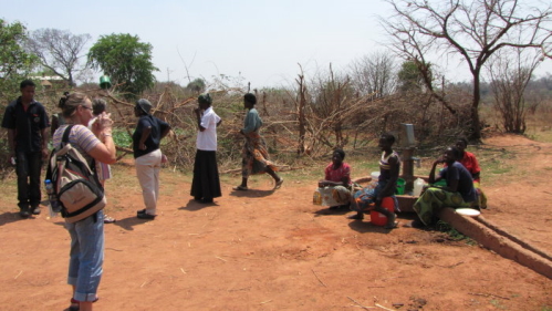 Besøg ved en skolehave, uden for haven var en ny vandpumpe, hvor egnes beboere hentede alt deres vand. |