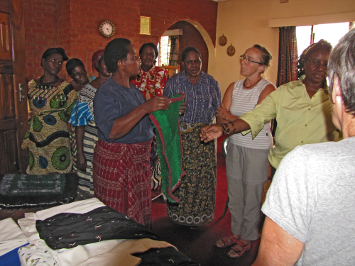 Her viser de frem hvad de har syet på de maskiner vi havde sendt ned til dem < |