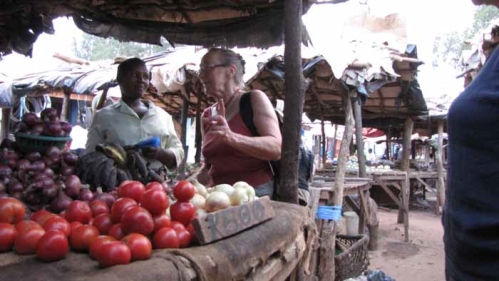 Kl. 16.30 kørte vi ned til byen. Vi havde 2 af de ældste damer med. De blev sat af nede i byen og der stod der en mand og fortalte at hans kone havde bedt ham om at vise os, hvor vi kunne få noget benzin. Nogle af os ville gerne en tur på markedet og andre skulle finde noget benzin at fylde på bilen. Vi opdagede, at det kun var et grøntsagsmarked og så havde vi ikke så meget lyst til, at gå rundt der. Den ældre mand talte i telefon hele tiden (han havde en til hver hånd). Han fortalte, vi kunne få benzin ved grænsen, inden vi kørte ind i Malawi. Vi spurgte, om vi skulle have pas med, nej, nej, nej, for det var på denne side af grænsen.