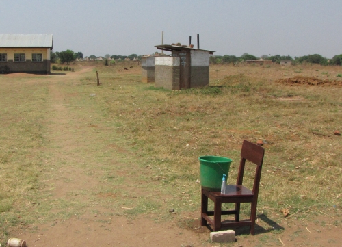 Et af de projekter, de var meget stolte af, var toilethuset bag ved stolen. Det var et stort fremskridt at få børnene til at benytte et toilet. Den grønne spand indeholder vand og er til håndvask efter toiletbesøget |